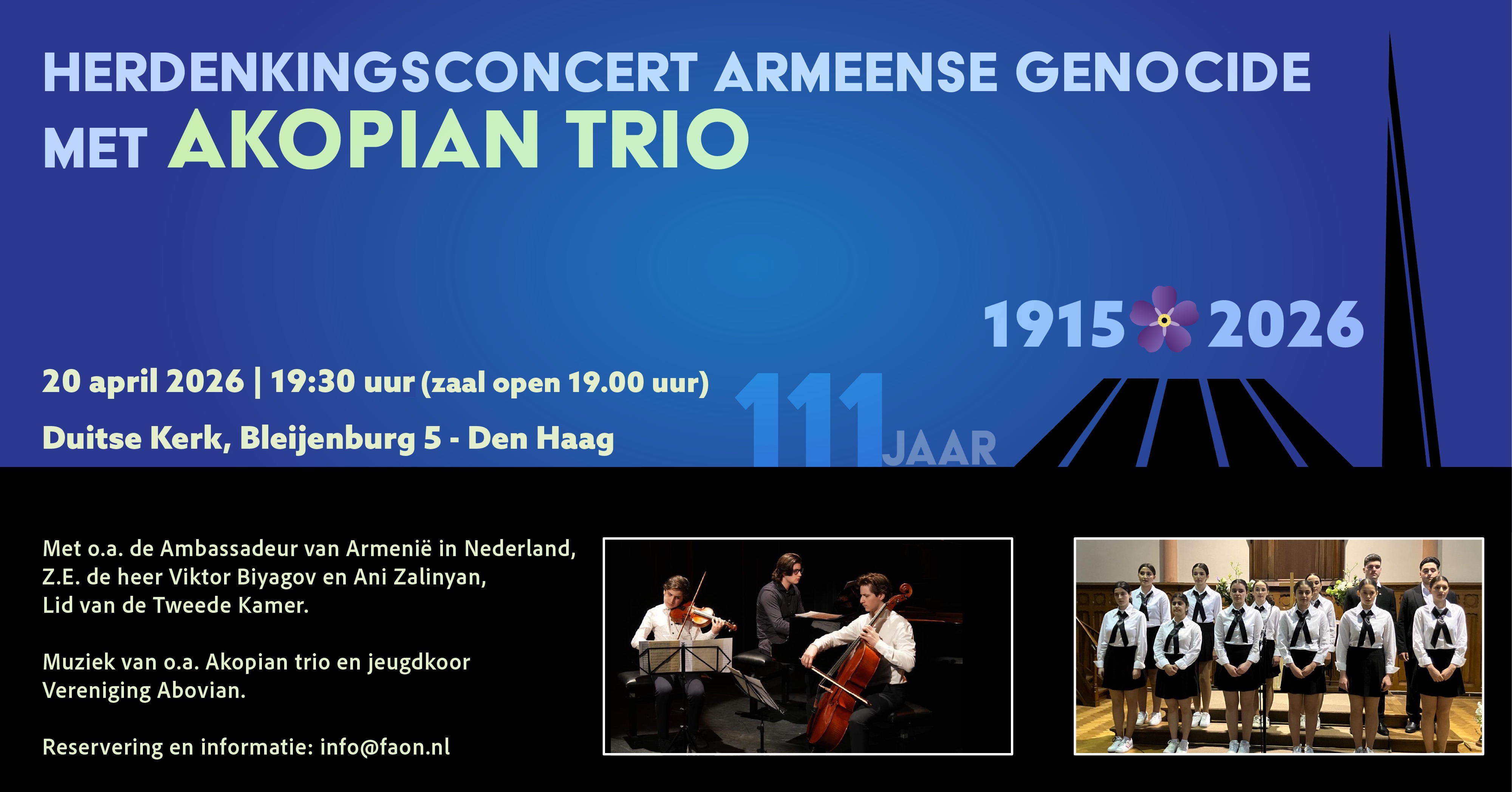 The 24 April Committee of the Federation of Armenian Organisations in the Netherlands (FAON) has the honour to invite you to attend the commemoration evening marking the 111th anniversary of the Armenian Genocide.