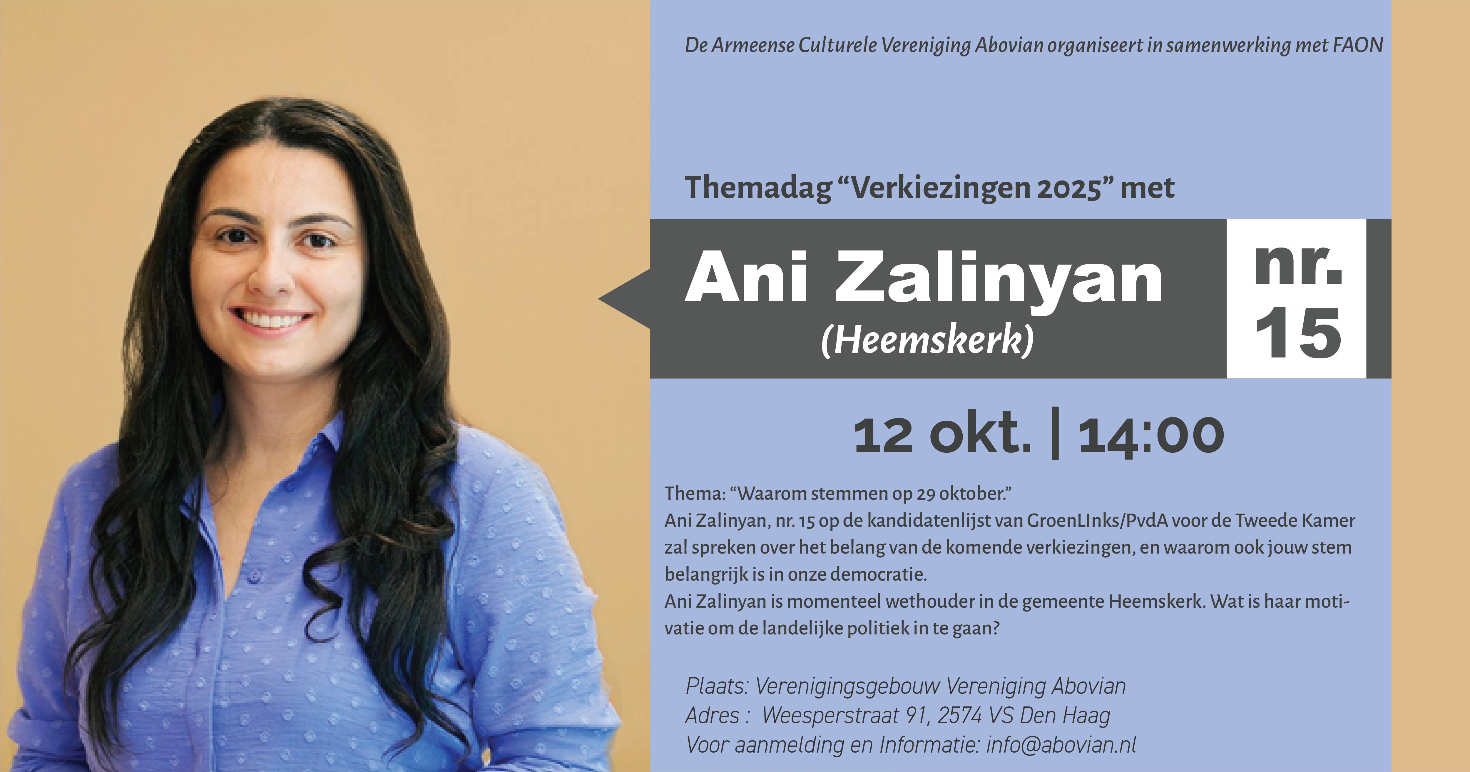 Ի՞նչ` | Թեմատիկ օր նվիրված 2025 թ. խորհրդարանական ընտրություններին Անի Զալինյանի մասնակցությամբ։ Անի Զալինյանը, առաջիկա խորհրդարանական ընտրություններում GroenLinks/PvdA դաշինքի ցուցակի 15-րդ համարի թեկնածուն է։ Նա կխոսի առաջիկա ընտրությունների կարևորության մասին և թե ինչու յուրաքանչյուր քվե կարևոր է ժողովրդավարության համար։